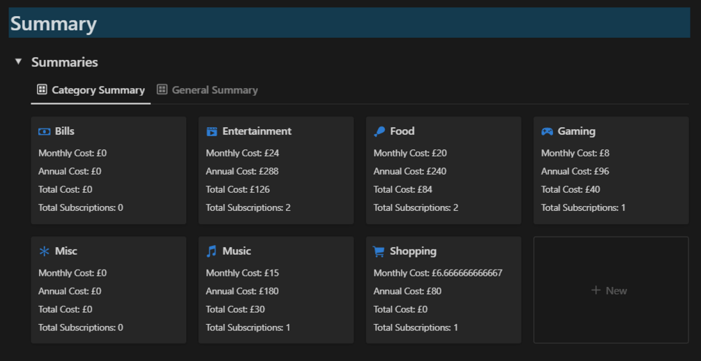 • You have the opportunity to look at summaries for different things. You can view the category summary which allows you to see the monthly cost, annual cost, total cost, and total subscription amount of all the subscriptions in that category. You can also see a general summary, which shows the total monthly cost, annual cost, total cost and total subscription amount for all subscriptions
